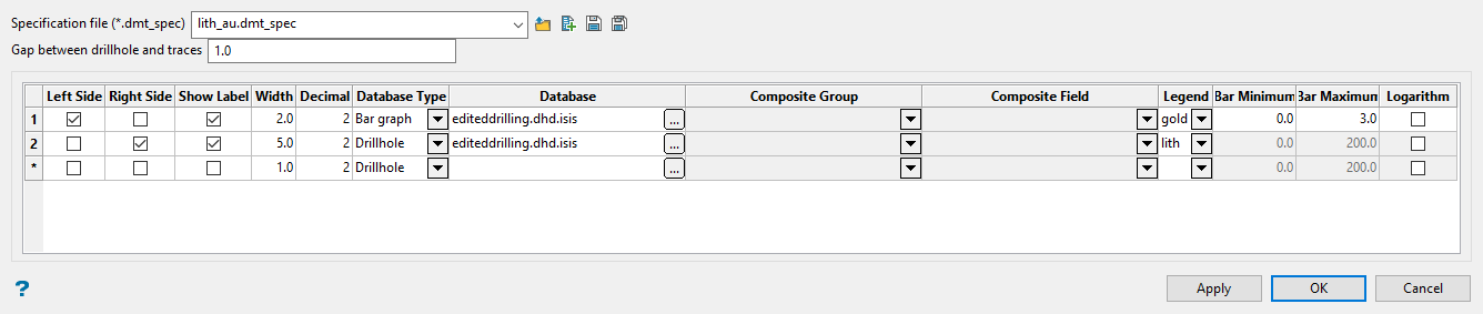 Tip: Although it is not absolutely necessary, it is recommended that you load and display the drillholes you want to view, then display them in section view. This will make it easier to set up the Multiple Trace Display panel since you will be able to view the immediate results by clicking the Apply button.