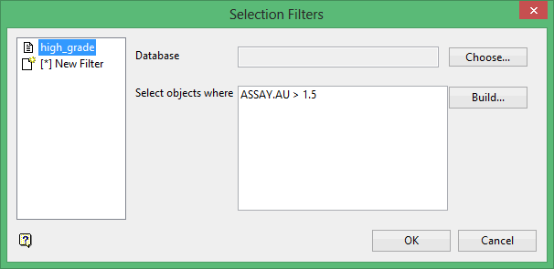 Use the Selection Filter option to create or, if applicable, edit selection filters that can be used to select subsets of drillhole database objects for loading or reporting purposes. Drillhole database objects are also called database keys, referring to all the data associated with a particular database key name.