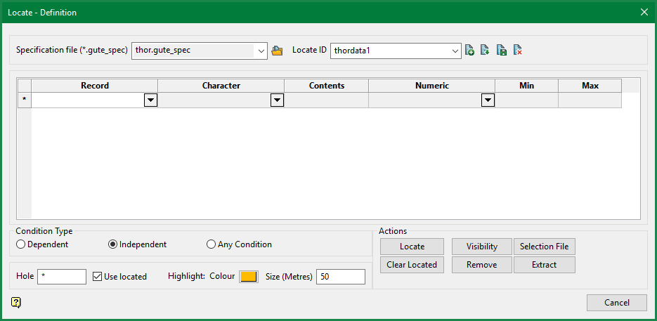 Clear Located Clears the selection results to allow another search. Visibility Render the selected drillholes invisible, or the unselected drillholes invisible. Remove Remove the selected drillholes, or remove the unselected drillholes. Selection File Create a selection file of the selected drillholes. Extract You can export the drillhole data to a database or CSV file.