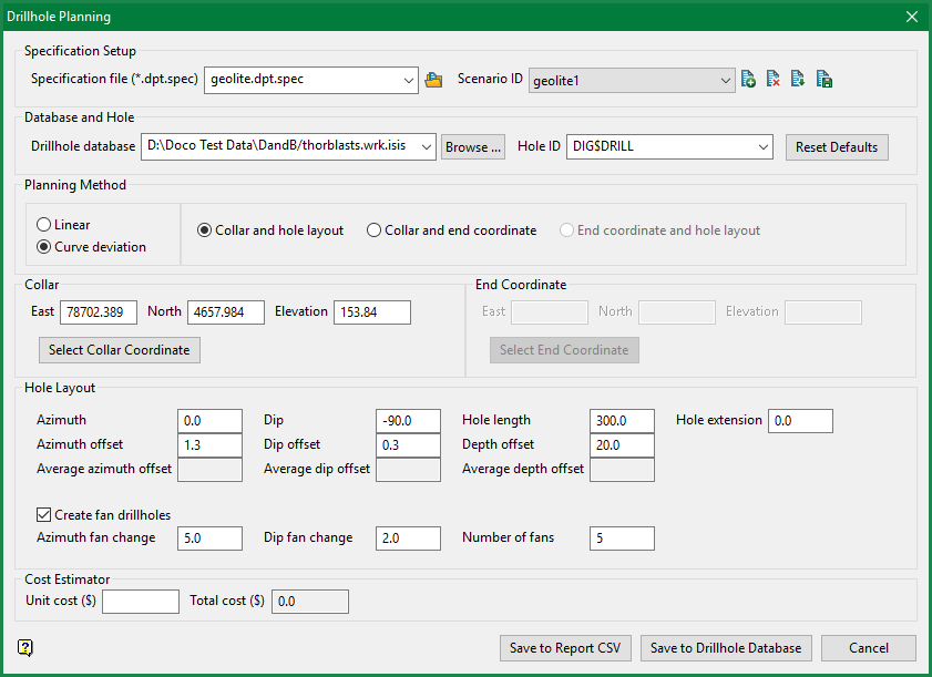 The Cost Estimator data will calculate the cost of the current hole as the Unit cost ($) multiplied by the Hole length.