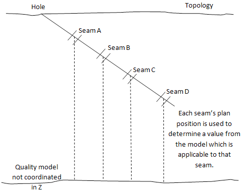 Alternatively, the second method is the best method to use if the Extra Models represent quality information which might be applicable to the seams; for example ASH, pH, etc. That is, models which don’t have a 3D position as such, but represent a value associated with a 3D position. Attempting to intercept the hole trace with such a model (as in the first method) may not result in any intersection in the model space because the models are not coordinated in the Z dimension (see the figure below).