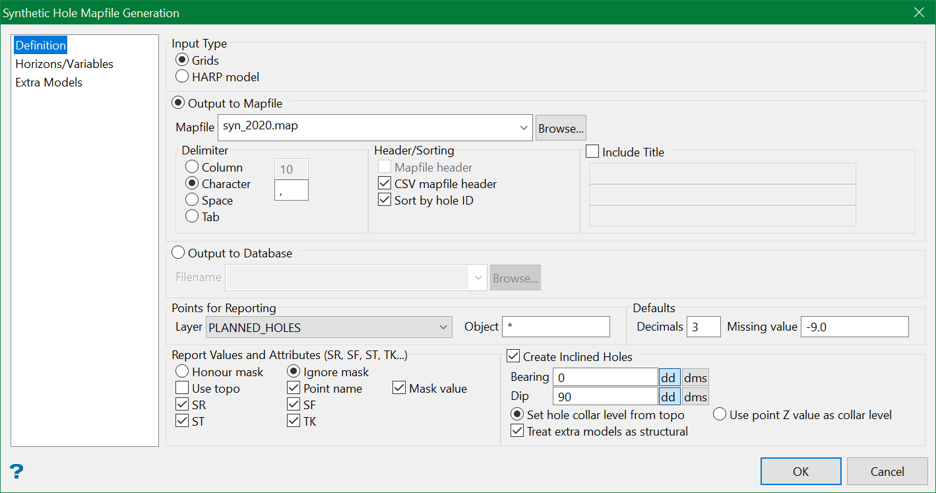 One further piece of information needs to be provided when using inclined holes, and that is how to handle any Extra Models used to provide additional information for each intercept in the generated mapfile (see the 3rd tab on this panel for Extra Models).