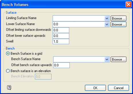 Select this option if the bench surface has been defined as a grid, or if it is parallel to a modelled grid surface but offset either upwards or downwards, for example a 90 foot above coal bench. You will need to supply the <gfi>.<MV> parts of the grid name.