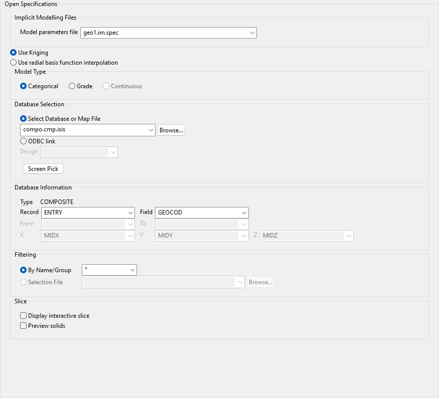 Select Isis File, ODBC Link, or Screen Pick to specify the database you want to use. You may select a drillhole database or a composite samples database. If you select a composite database, there will be no further processing of the composites, except for the possibility of excluding small intervals. If you select a drillhole database, sample intervals will be created automatically.