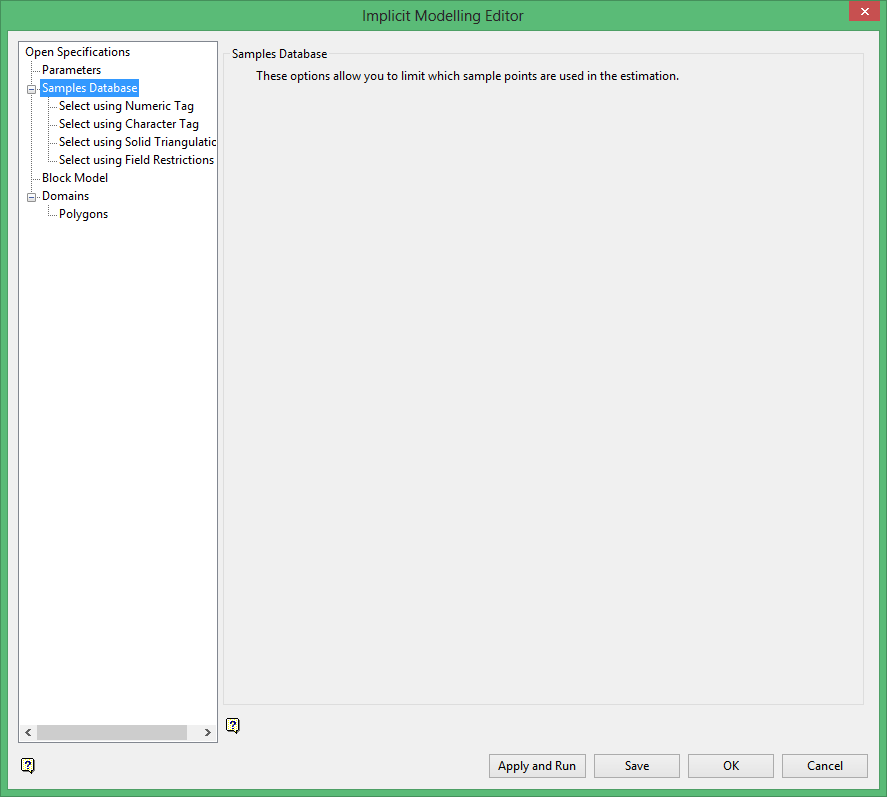 This topic includes information about the Samples Database branch of the Implicit Modelling Editor.