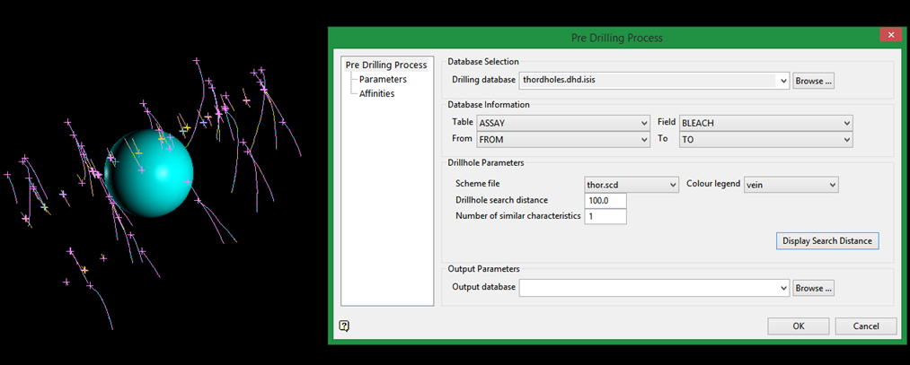 Enter the radius to search for others drillholes with the same rock type. Â If one or more is found, then the drillhole will not be processed since the current rock type could have continuity. Â To see the radius, click the button Display Search Distance.