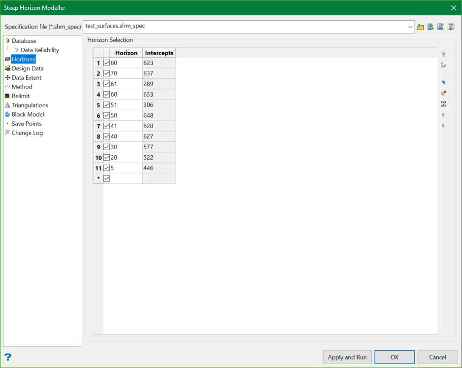 This section allows the selection of modelling horizons. There is a set of controls on the right to list the horizons and their respective intercepts.