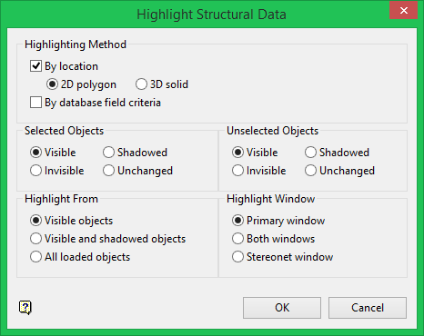 Highlighting by 2D polygon allows you to select a polygon in the Primary Window and limit the selection of structural data to in that polygon. Highlighting by 3D solid allows you to select a solid triangulation in the Primary Window and limit the selection of structural data to in that solid triangulation.