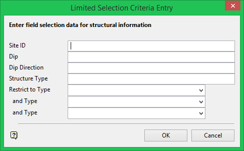 The Selection Criteria panel displays once the Highlight Structural Data panel has been completed. The Selection Criteria panel will list all of the available fields in the structural database. You can then specify the values to be met for any of these fields in order to be highlighted. If this checkbox is not ticked, then the Limited Selection Criteria panel displays. This panel allows you to specify selection criteria for a subset of the fields only.