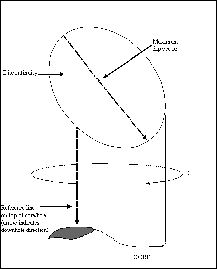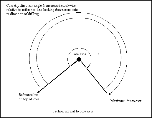 The beta value corresponds to the angle between the reference line and the bottom of the structure. This is measured in a clockwise direction when looking along the core in the direction of drilling, from a reference line on the top of the hole/core.