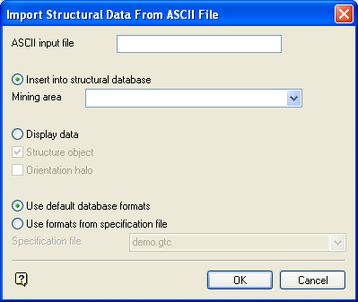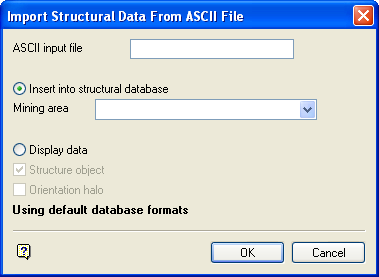 Enter the name of the ASCII file containing the structural data to be imported into the structural database. Each line in the file must correspond to a structural data record, and be prefixed by the record number for the record GEOTEC.