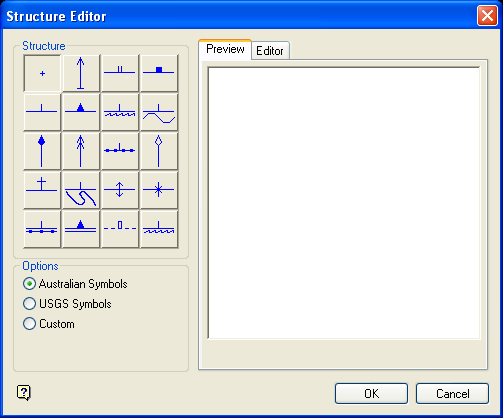 This section contains a collection of predefined Geotechnical symbols. The units defined in your project specification file (.dg1), i.e. metric or imperial, will dictate which symbols are displayed through the Structures section i.e. Australian or USGS. No matter the default, either set of symbols will be available for use.