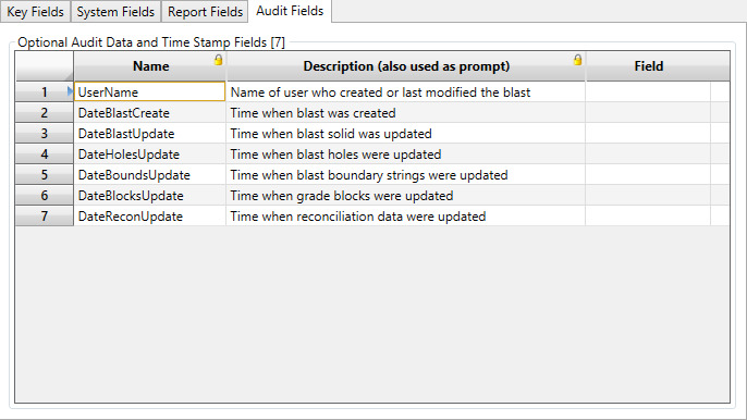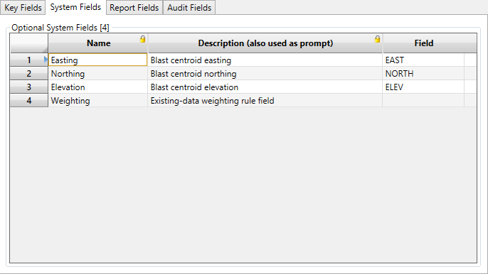 The first three tell the system which fields to use if the blast centroid value is to be written back to the blast header record. These fields are all optional, but with some rules – if any field is provided then either Easting & Northing (2D) or Easting, Northing & Elevation (3D) must be provided.