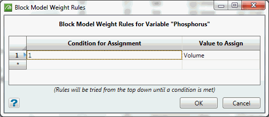 This column will only be enabled if either or both of pre-existing source block-model or generated block-model have been specified in the Data Source Definitions. This allows the user to specify how values are to be weighted from the block-model when used for any of weighted Grade-Block Rule Types (Wtd. Mean, Std. Dev., and Variance).