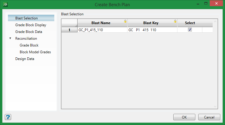 On the Grade Control menu, click Create Bench Plan to display the Blast Selection Parameters panel.
