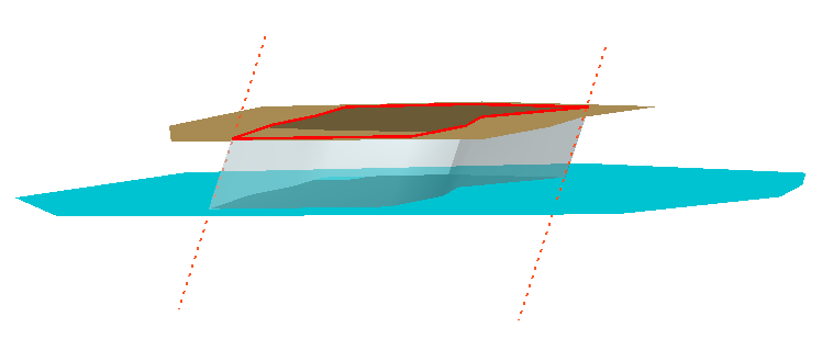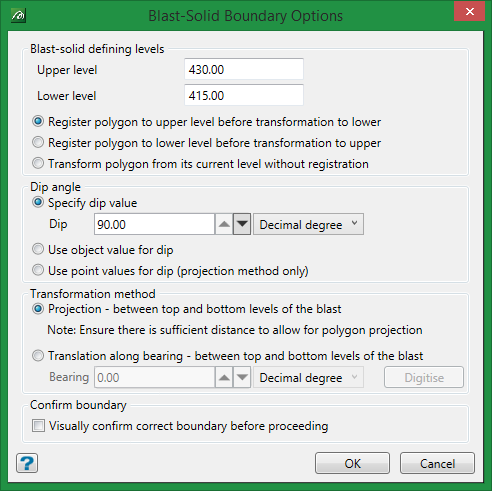 Select whether to register the polygon to the upper surface, the lower surface, or to continue without registering it to either surface. With a dip angle of 90 degree (straight up) registration will not make a difference. However, if the dip is at an angle other than 90 degrees, then the aerial offset could be significant depending on the distance the polygon is above the surface. In such cases, we recommend registering the polygon to the surface.