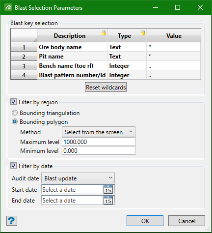 On the Grade Control menu, click Load Blast to display the Blast Selection Parameters panel. Use this panel to specify which blasts to display in the selection panel.