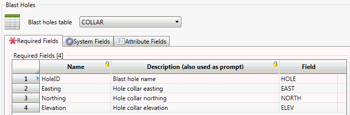 If Grade-Control database Blast-Holes were selected in the Data Source Definition as the source for data, then this option must be turned on (and this tab completed) to provide valid specifications.