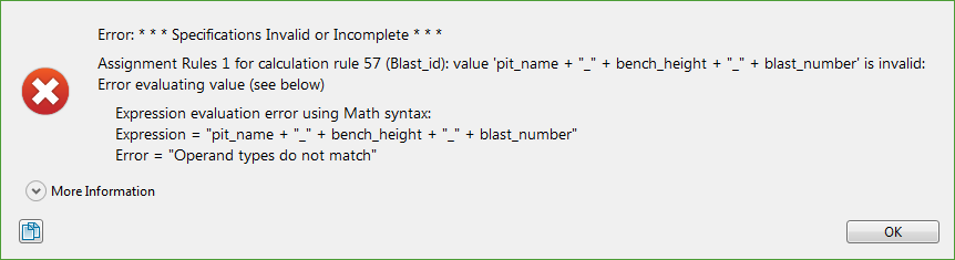 The error message reads Operand types do not match. A guess can be made from their names that bench_height and blast_number are most probably NUMERIC, so pit_name must be STRING if there is a mismatch. Checking the Calculation Rules set up for their datatypes confirms this. So, to correct this concatenation for the STRING variable Blast_id, the NUMERIC variables need to be converted to strings. There are built-in functions for the expression handler used by the Assignment Rules to handle this. Refer to the Appendix to know more.