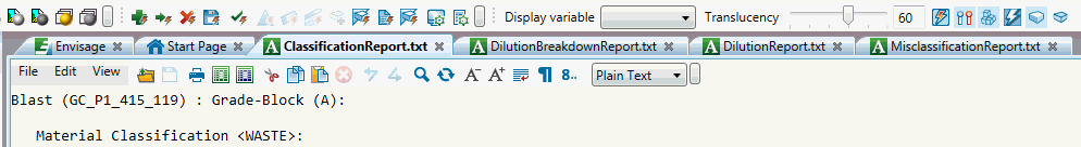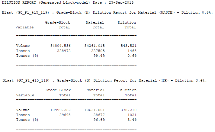 This information is presented as a short section for each grade-block being reported. This section comprises a summary header line for the grade-block – with the material type and dilution percentage away from it. The rest of the section is simply the breakdown of the dilution as volume and mass for the classifying material and other (diluting) material.