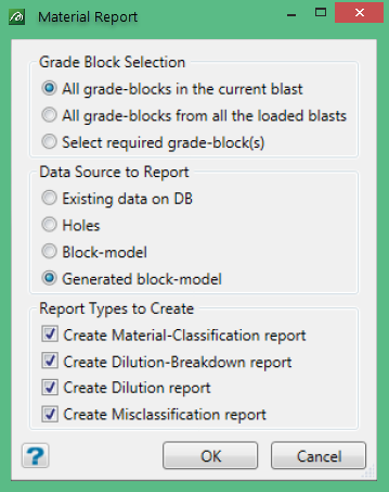 To use the Material Report option, there must be at least one blast containing grade-blocks currently loaded. Selecting the option will display the following panel, which works in conjunction with the Material Report Setup specifications to configure the output that will be seen.