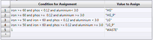 In our example, for grade-block A (the WASTE block) there can be no attribute breakdown of the categorisation for material. The condition met in this case is line 5, which is merely the default case (the fall through option) on the assignment rule list. However, for grade-block B the material classification attributes can be broken down for the condition statement met, which in this case is line 1. Here we see the value for each categorising attribute shown and the clause(s) of the assignment rule for that attribute.