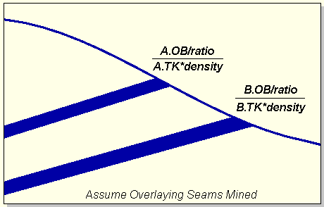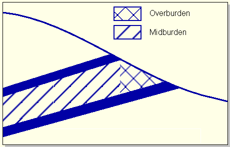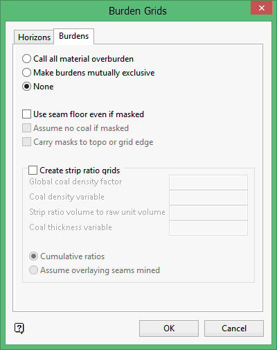 The burden material is then limited by the masked portion of the upper seam. You must be sure that the masked portions of your grids have valid interpolated (or extrapolated) values. If you do check this checkbox, then you can choose to treat the coal thickness in those regions as zero (see the Assume no coal if masked option).