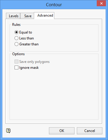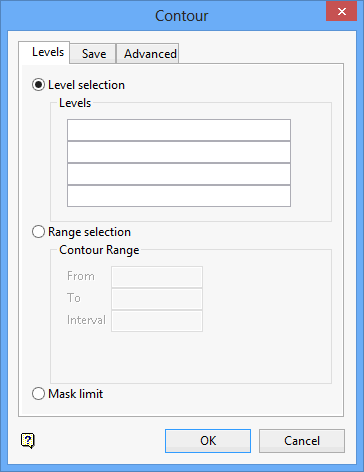 Select this option to contour specific levels. For example, for a thickness grid use 0.01 and select Greater than (under the Advanced tab ) to generate a contour that includes only the grid cells with values greater than 0.01 metres. The levels to contour must be greater than 0.