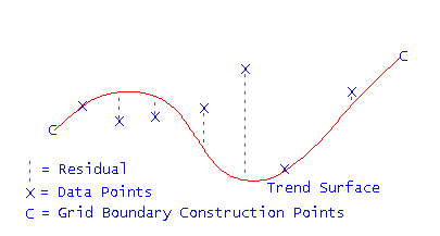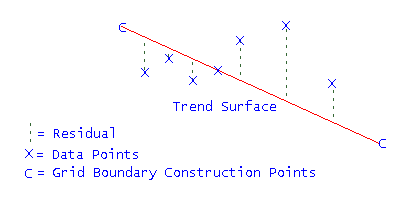 A trend surface is a first (flat plane - straight line), second (bowl - parabolic) or third (undulating in X and Y - cubic) order surface of best fit for the data points. The difference between the original data points and the interpolated value as determined by the trend surface is called a residual. The residuals will be relatively small positive (above the trend) and negative (below the trend) numbers. The residuals are then modelled to form a 'residuals grid'. The trend equation is then added to each node of the residuals grid to produce the final seam variable grid.