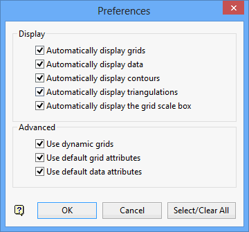 Use Preferences to set parameters to automatically display grids, design data, contours, triangulations, and the grid scale box, removing the need to use one of the display options when loading these objects.