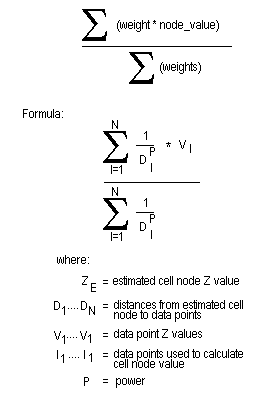 The grid node values are determined by taking a weighted average of the collected data points. Therefore, the closer a drillhole is to the grid node, the greater the effect it will have on the calculated node value. The weighting used is the inverse of the distance to the nominated power (the default value is 2).