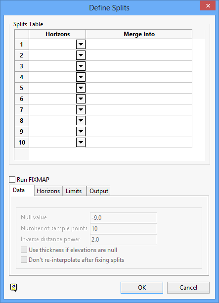 Select this checkbox to run FIXMAP (upon completion of this panel). FIXMAP is a utility that takes a set of standard Vulcan stratigraphic mapfiles and produces a new set. Values are interpolated for missing horizons by estimating the position and thickness of each horizon in each hole using the inverse distance method. It is also possible to run FIXMAP from the command line.