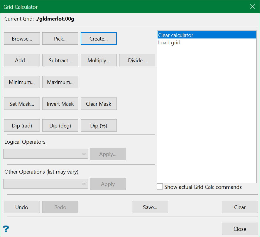 The tool keeps a track of the recent grid operations which can be seen as a list on the right. Selecting the checkbox shows the actual Grid Calc commands of the operations.