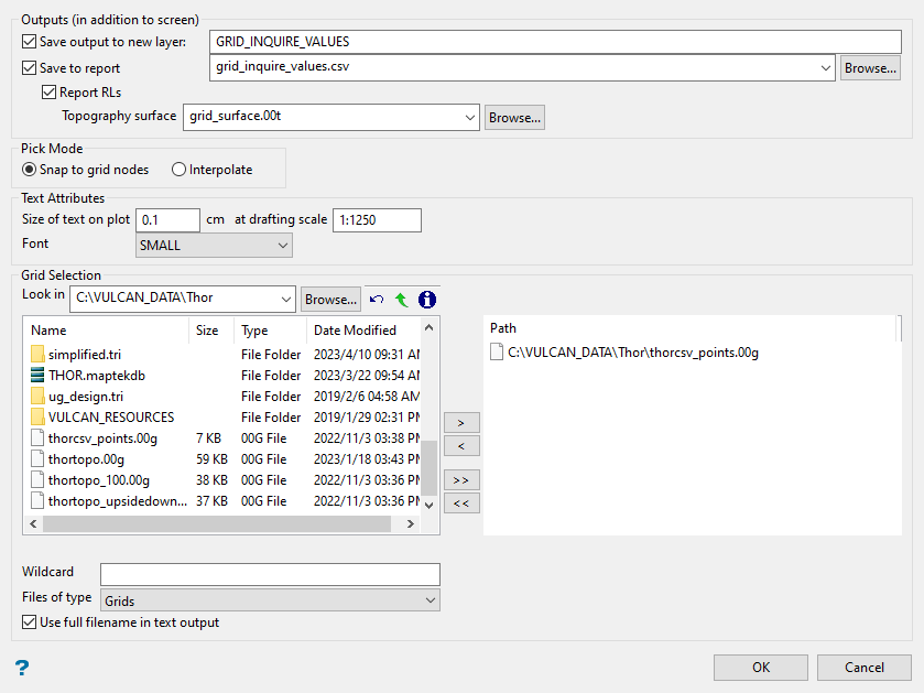 The only steps that are required is that you select a grid and click OK. The outline of your grid will be displayed on the screen where you will be able to click anywhere within the boundaries of the grid to display the grid values for that location. All other parameters on the panel control the options that are available regarding how the information is displayed, whether or not you want to save the results.