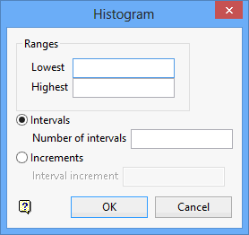 Enter the histogram range. If used in conjunction with Intervals, then the range is divided into 'n' intervals. For example, if the range is 0 to 100 and the number of intervals is 5, then the histogram boundaries are 0-20, 20-40, 40-60, 60-80, 80-100.