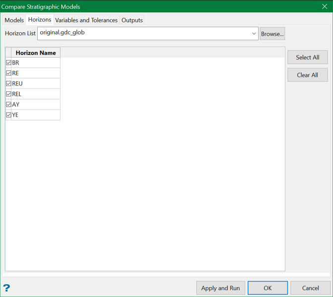 On the Grid Calc menu, point to Integrated Stratigraphic Modelling, then click Compare Stratigraphic Models to open the following interface.