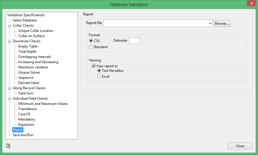 This section to specify the format of the resulting validation report file. The resulting file can either be saved as a CSV formatted file (.csv) or as a standard ASCII formatted text file (.txt).