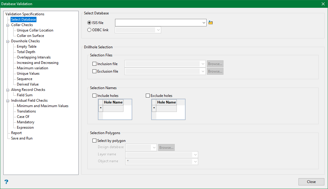 If fewer drillholes need to be included or excluded, the hole names may be entered directly in the respective grids. The drillholes identified are saved in the specification file for use in later runs.