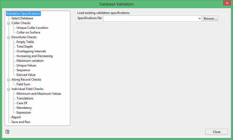 Any required database validation setup is saved as a specification file (.dbv). Specification files are useful when performing the same validation tests on multiple databases. For example, the same validation may be performed after each update to an Isis database.