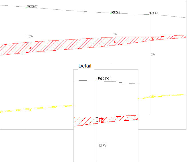 When DOW is used, the RE horizon in hole 99S062 is interpolated to a full thickness as defined by the surrounding intercepts. This is because the logged roof and floor positions of RE in hole 99S062 both fall above DOW. This horizon can be subsequently cropped back to a weathering surface, such as topography, if required.