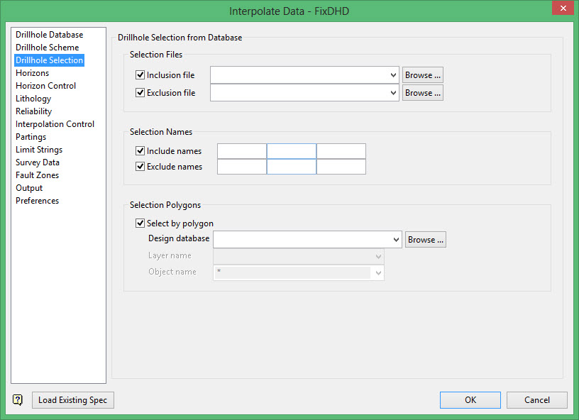 If a large number of drillholes need to be included or excluded, then it is advisable to create a selection file (.sel) consisting of the drillhole names.