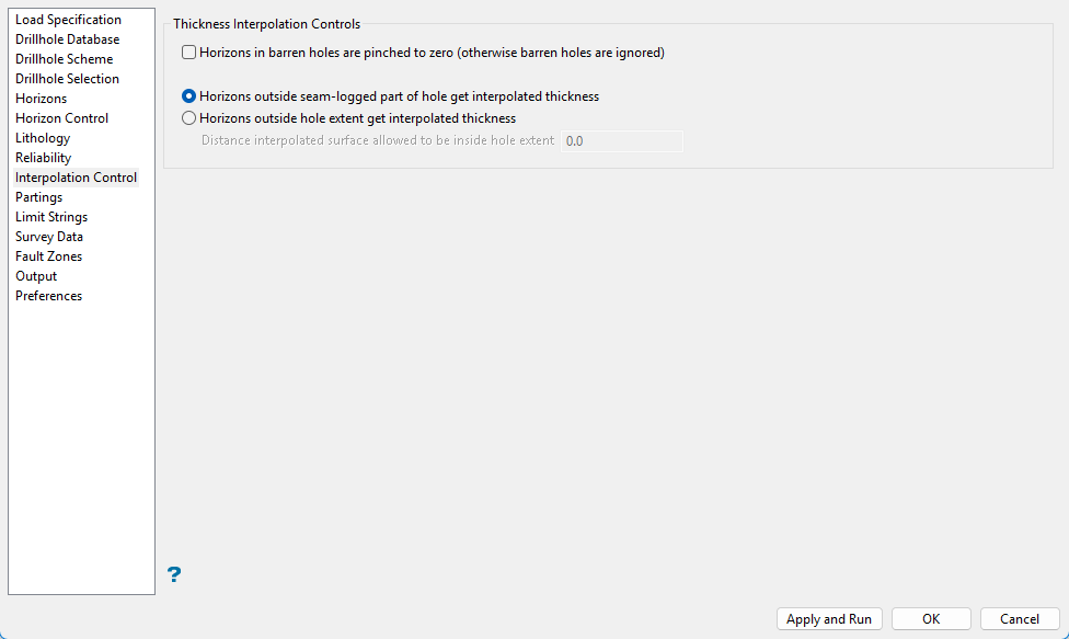 No matter which option is selected, horizons which fall entirely below the extent of the hole are interpolated with full thickness. In other words, when the interpreted position of a horizon falls outside the extent of a drillhole trace, full horizon thickness is inferred.