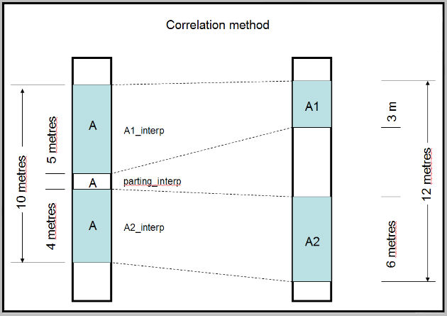 With the Correlate partings from merged horizons to the splits/gaps using the measured depths option, this parting in which the interpolated boundary lies then becomes the interburden between the daughters, rather than parting in both. Likewise a parting lying in a daughter split is attributed to that split only. This situation is that the parting(s) are correlated to the appropriate splits.