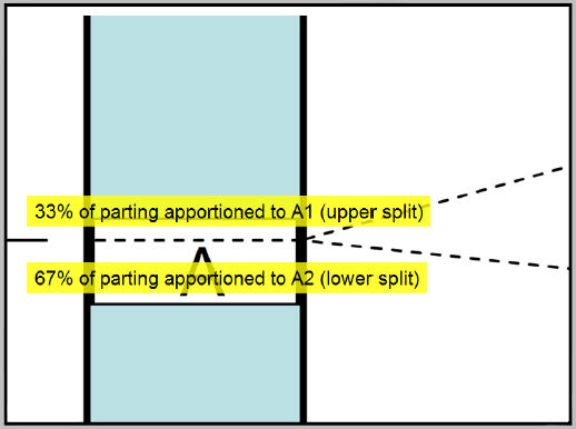 The thickness of horizon A2 forms 67% or the thickness of horizon A. (6 metres : 10 metres) Therefore, horizon A2 will get 67% of the parting located in horizon A