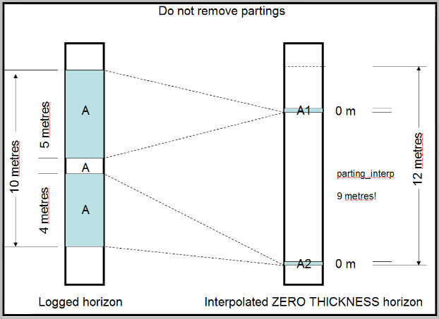 When using the Interpolate partings as an absolute parting thickness option, it is possible for the parting thickness to be calculated as greater than the horizon thickness. If this occurs, the parting thickness is reduced to the horizon thickness.