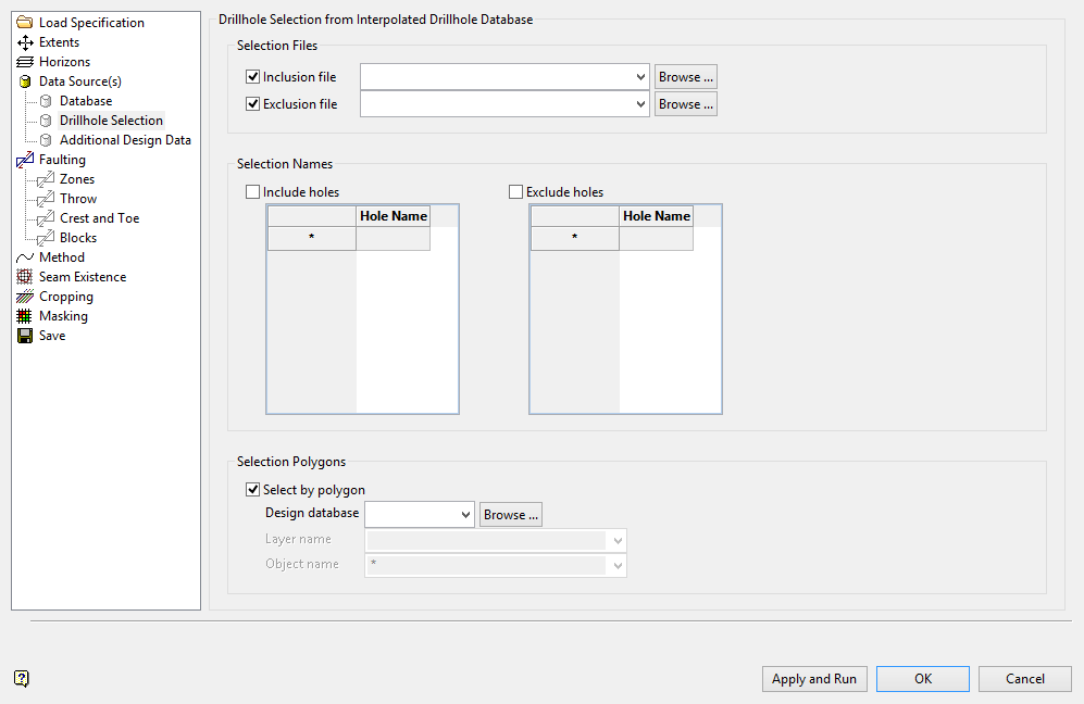 Drillholes can either be limited by name or by position. If none of the options in this section are selected, then all available drillholes are used. Entries in the nominated Drillhole Selection files (.sel), as well as the drop-down lists, may contain wildcards (both * multiple and ? single character).