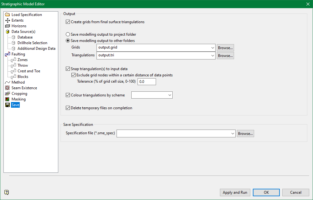 Use this section to specify the storage location for the modelling output. You can choose to either save the output in the current working directory or in another location. When outputting to another location, the .tri and.grid folder extensions can be used to display the folder and its contents in the Vulcan Explorer application.
