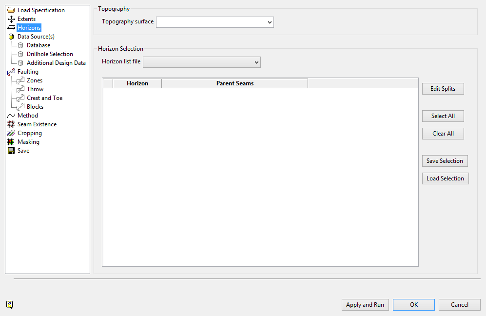 Select from any available Gdc_Glob files in the current working directory, individual horizons may also be switched on or off for the current modelling run by using the checkboxes. These subs-elections may also be saved independently to the overall specification.