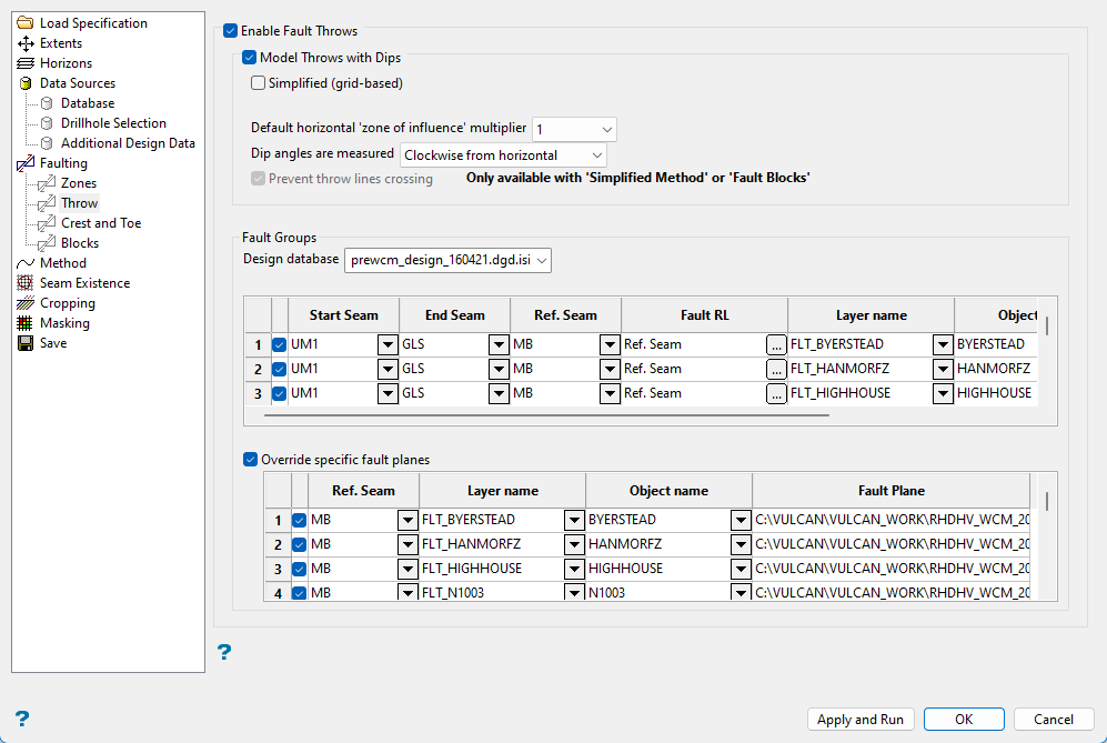 A horizontal zone of influence needs to be specified for the throw faulting. The number used is dependent on the throw, large throws require a much larger horizontal zone of influence. Small throws require a small zone of influence.
