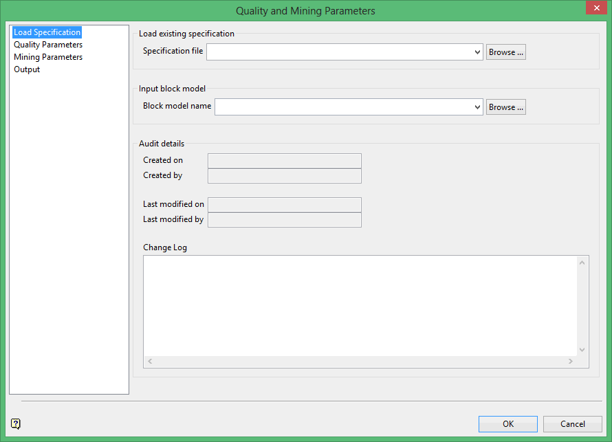 If available, select or browse to an existing Quality and Mining Parameters Specification file. These have the extension.rom_parameters. If no specification file exists, there will be an opportunity to save panel configurations to a new specification file on the Output subpanel. See Output below.